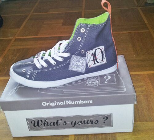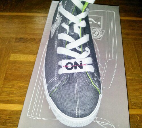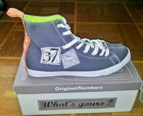 Les sneakers quant à elles, représentent tout à fait l’esprit de la marque avec ses patchs et ses numéros attribués au hasard, je serais curieux de savoir qui a les même numéros que moi (37 et 40). Ce sont des sneakers hautes, conçues en toile et caoutchouc. La toile est grise et les semelles sont colorées en vert un peu fluo, elles sont marquées par quelques petits détails qui donnent de la personnalité à la chaussure, qui est agréable à porter, de vraies pantoufles!
