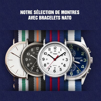 - Les modèles Timex montées sur des bracelets nato en nylon, elles ne sont pas en soldes mais elels sont à un prix tout à fait abordable 55 euros pour un style urbain (images 1 et 2)