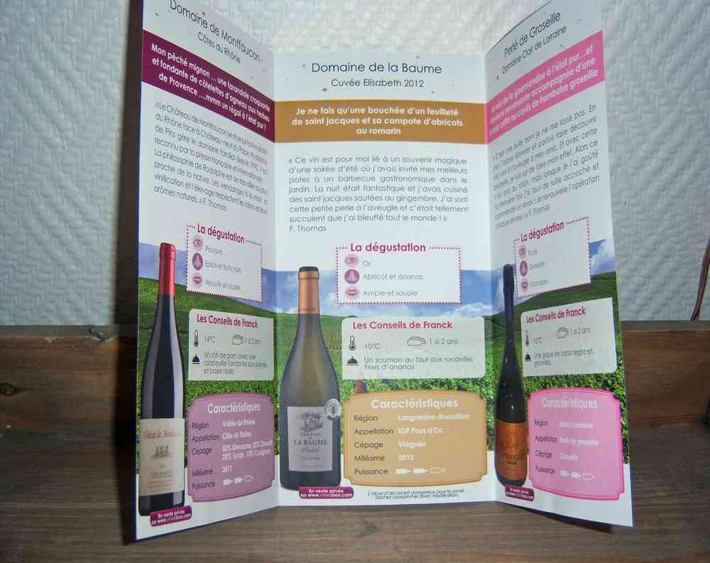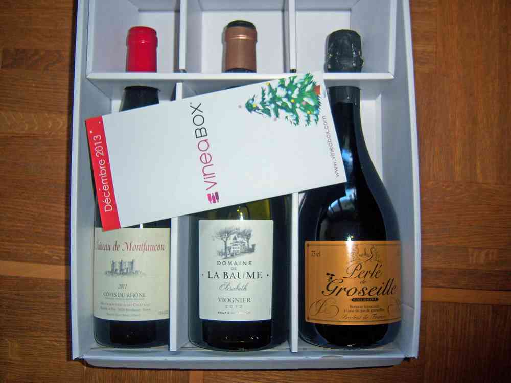 Cette Vineabox de décembre 2013 était bien entendu marquée par les fêtes de fin d’année, le sommelier Franck Thomas a donc voulu introduire un contenu festif , 3 bouteilles composent cette édition : un rouge des Côtes du Rhône, un Viognier et un vin Pétillant à base de jus de groseille!