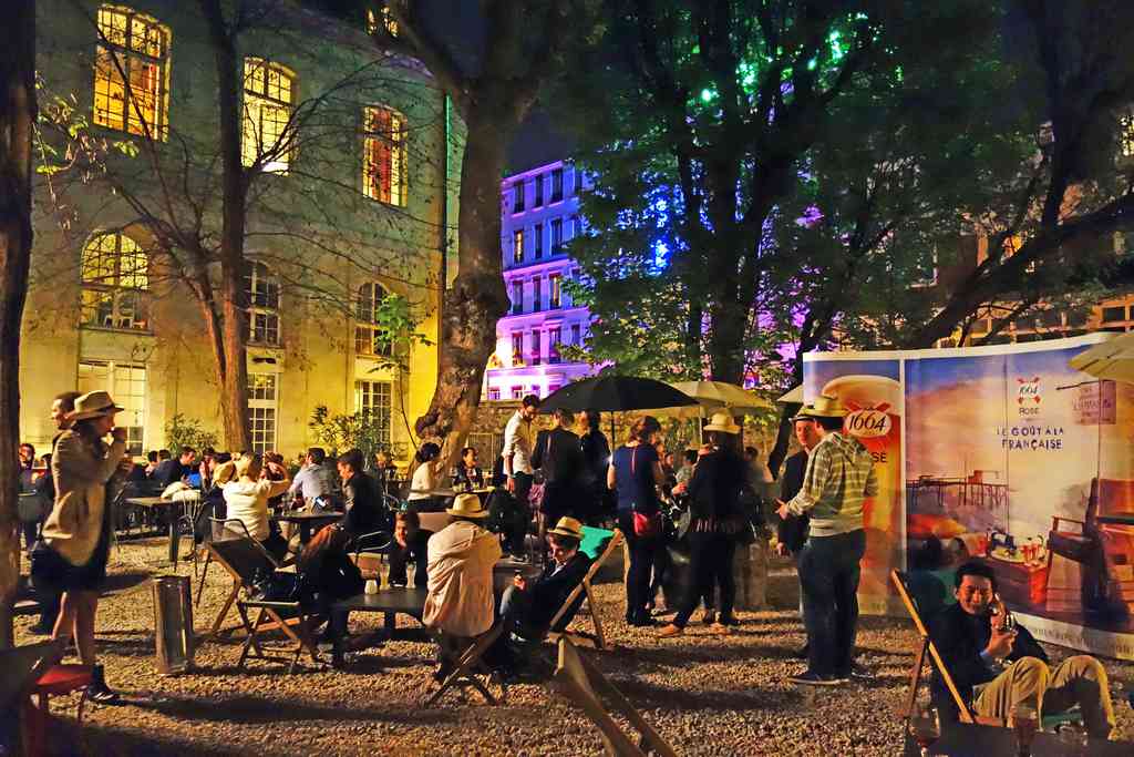 Revenons-en à nos moutons et au divin #apéro1664. Situé à deux pas de la gare de l’Est et du Canal Saint-Martin, le Café A a pris ses quartiers dans l’ancien Couvent des Récollets construit aux XVIIe et XVIIIe siècles. Ambiance monastique pour un lieu qui a longtemps été un squat artistique et qui aujourd’hui abrite l’une des plus belles terrasses de Paris. Attention mesdames, le gravier la rend impraticable en talons aiguille. Heureusement, les transats amortissent les chutes des donzelles haut-perchées. Ce soir, le temps est clair, la foule nombreuse à se presser à l’entrée de cet événement raffiné. Et ni l’équipe de la sécurité fort grognon, ni les humeurs des demoiselles de l’accueil ne sauraient mettre à mal la nôtre.