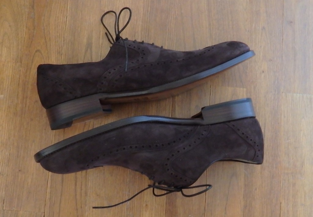 Cette chaussure de ville a été réalisée avec du cuir de velours de bonne qualité. C’est un modèle très élégant et raffiné. Sa tige est élaborée à partir de plusieurs pièces et se distingue entre autres par son bout golf et son contrefort. La chaussure présente des motifs perforés (lyra en anglais) sur certaines pièces de sa tige. Son laçage fermé à 5 trous est typique de celui d’une Richelieu.